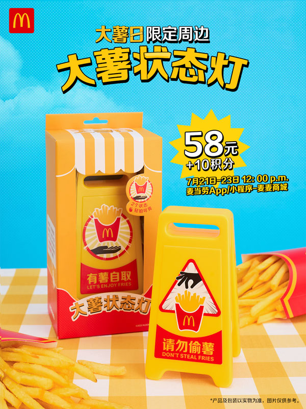 以粉丝共鸣为灵感,打造“吃薯条专用”周边 薯条是麦当劳全球广受欢迎的经典产品之一。自2015年起,麦当劳中国每年在夏季大暑节气举办“大薯日”,通过优惠、周边及互动体验,打造与粉丝一同欢庆的麦当劳社交媒体粉丝节,“大薯日吃大薯”已成为品牌与消费者间的独特夏日约定。 今年,麦当劳基于消费者在社交媒体上分享的高共鸣场景——“朋友吃薯条时总会忍不住想偷一根”,推出限定周边“大薯状态灯”。 “大薯状态灯”形似道路指示牌,融合麦当劳经典薯条标识,设有“请勿偷薯”与“有薯自取”双面提示,点亮后可选择展示状态,提升吃薯仪式感与互动趣味,传递与朋友分享薯条的快乐氛围。7月21日起,“大薯状态灯”将通过麦当劳官方App/小程序麦麦商城、抖音商城、天猫商城正式发售。 麦当劳中国以粉丝共鸣为灵感,打造提升吃薯条仪式感周边“大薯状态灯”